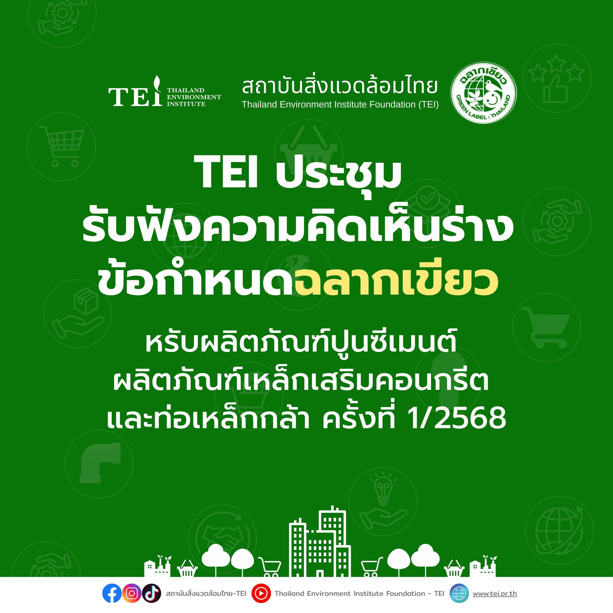 15 กันยายน พ.ศ. 2567 เวลา 9.00–16.00 น. สถาบันสิ่งแวดล้อมไทย (TEI) นำโดย ดร.ฉัตรตรี ภูรัต ผู้อำนวยการฝ่าย ฉลากเขียวและฉลากสิ่งแวดล้อม ดร. ถนอมลาภ รัชวัตร์ นักวิจัยอาวุโส และคณะ ได้จัดการประชุมรับฟังความคิดเห็นร่างข้อกำหนดฉลากเขียวสำหรับผลิตภัณฑ์ปูนซีเมนต์ ผลิตภัณฑ์เหล็กเสริมคอนกรีต และท่อเหล็กกล้า ครั้งที่ 1/2568 ณ ห้องอโศก ชั้น 4 โรงแรมอีสติน แกรนด์ พญาไท กรุงเทพฯ