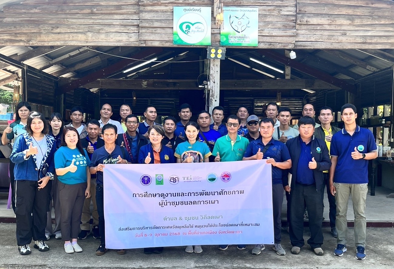 8-9 ตุลาคม 2568 สถาบันสิ่งแวดล้อมไทย หรือ TEI โดยโครงการพัฒนากลไกความร่วมมือขับเคลื่อนแผนปฏิบัติการร่วมยุทธศาสตร์ฟ้าใส (CLEAR Sky Strategy) และการพัฒนาความร่วมมือเมืองคู่ขนาน ไทย ลาว เมียนมา ขับเคลื่อนการจัดการและลดมลพิษหมอกควันข้ามแดน โดย นางสาววิลาวรรณ น้อยภา หัวหน้าโครงการ และคณะนักวิจัย ร่วมกับคณะเจ้าหน้าที่สถาบันวิจัยและพัฒนาพื้นที่สูง (สวพส.) จัดกระบวนการแลกเปลี่ยนเรียนรู้และพัฒนาศักยภาพผู้นำพื้นที่สูงวาวี ศึกษาดูงาน “พะเยาโมเดล” แนวฏิบัติดีลดการเผาและการจัดการเกษตรยั่งยืน ให้กับผู้นำและแกนนำชุมชนพื้นที่สูงวาวี ต.วาวี อ.แม่สรวย จ.เชียงราย จำนวน 20 คน ให้เกิดการแลกเปลี่ยนข้อมูล องค์ความรู้และการนำไปปรับใช้ในด้านการจัดการเศษวัสดุ หมุนวนใช้ประโยชน์และลดการเผาในพื้นที่เกษตรกรรมยั่งยืน