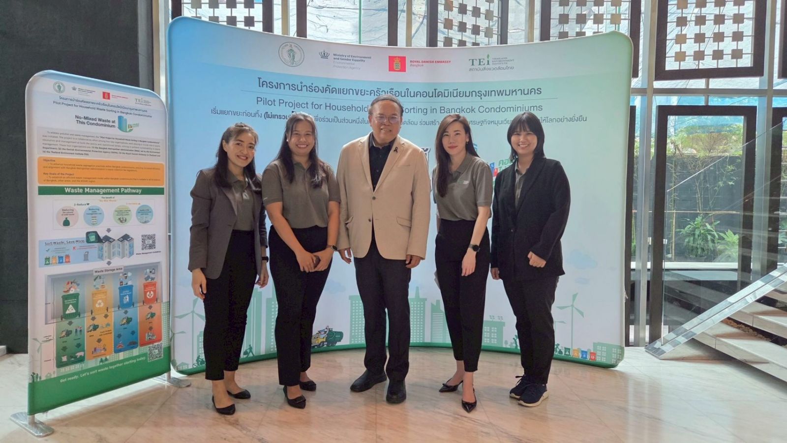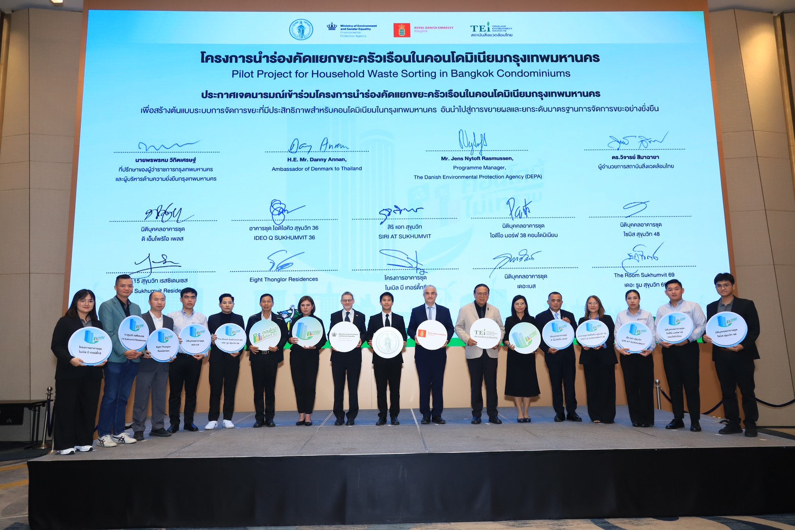 โดย “โครงการนำร่องคัดแยกขยะครัวเรือนในคอนโดมิเนียมกรุงเทพมหานคร” (Pilot Project for Household Waste Sorting in Bangkok Condominiums) เป็นโครงการที่เกิดจากความร่วมมือของ 4 หน่วยงานหลักที่มีบทบาทสำคัญในการร่วมแก้ไขปัญหาขยะและการจัดการขยะทั้งในเชิงระดับนโยบายและการปฏิบัติในพื้นที่ เพื่อให้เกิดการบริหารจัดการขยะอย่างยั่งยืน โดย สำนักสิ่งแวดล้อม กรุงเทพมหานคร องค์การพิทักษ์สิ่งแวดล้อมแห่งเดนมาร์ก (DEPA) สถานเอกอัครราชทูตเดนมาร์ก ประจำประเทศไทย และสถาบันสิ่งแวดล้อมไทย ได้ร่วมกันดำเนินโครงการ โดยมีเป้าหมายหลักในการสร้างต้นแบบระบบการจัดการขยะที่มีประสิทธิภาพสำหรับคอนโดมิเนียมในกรุงเทพมหานคร เพื่อนำผลการดำเนินงานของโครงการฯ ไปพัฒนาต่อยอดและขยายผลไปยัง 50 เขตของกรุงเทพมหานคร และพื้นที่อื่น ๆ รวมถึงภูมิภาคอาเซียน เพื่อเป็นการยกระดับมาตรฐานการจัดการขยะอย่างยั่งยืน นอกจากนี้ ภายในงานแถลงข่าวได้มีพิธีประกาศเจตนารมณ์เพื่อร่วมเป็นส่วนหนึ่งในการสร้างต้นแบบการจัดการขยะอย่างยั่งยืนตามนโยบายและแผนการจัดการมูลฝอยของกรุงเทพฯ โดยมีคอนโดมิเนียมในพื้นที่เขตคลองเตยและเขตวัฒนาของกรุงเทพฯ ที่เข้าร่วมภายใต้โครงการฯ จำนวน 10 แห่ง พร้อมกันนี้ ได้มีองค์กรภาคีเครือข่ายจากภาคส่วนต่าง ๆ มาร่วมประกาศเจตนารมณ์ อันเป็นการแสดงออกถึงความร่วมมือในการทำงาน เพื่อเป็นส่วนหนึ่งในการขยายผลไปยัง 50 เขตของกรุงเทพมหานคร และพื้นที่อื่น ๆ เพื่อเป็นการยกระดับมาตรฐานการจัดการขยะอย่างยั่งยืน ตามนโยบาย “ไม่เทรวม” และสอดคล้องตามข้อบัญญัติค่าธรรมเนียมการจัดการขยะฉบับใหม่ของกรุงเทพฯ