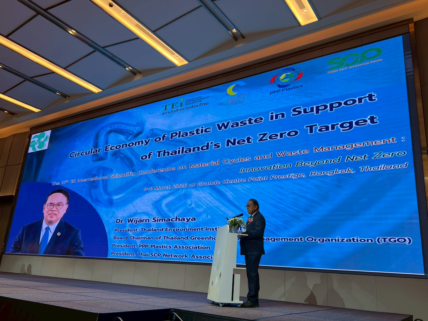 9 มีนาคม 2569 ดร.วิจารย์ สิมาฉายา ผู้อำนวยการสถาบันสิ่งแวดล้อมไทย (TEI) ในฐานะประธานสมาคม PPP Plastics ประธานคณะกรรมการองค์การบริหารจัดการก๊าซเรือนกระจก (TGO) และประธานสมาคม Thai SCP Network ได้รับเกียรติเป็นวิทยากรบรรยายพิเศษในการประชุมวิชาการนานาชาติ The 12th 3R International Scientific Conference on Material Cycles and Waste Management (3RINCs 2026) ภายใต้หัวข้อ "Innovation Beyond Net Zero" จัดโดยมหาวิทยาลัยเทคโนโลยีพระจอมเกล้าธนบุรี (มจธ.) ร่วมกับสมาคมด้านการจัดการขยะจากญี่ปุ่น เกาหลี และภาคีระดับนานาชาติ ณ โรงแรม Grande Centre Point Prestige Bankok