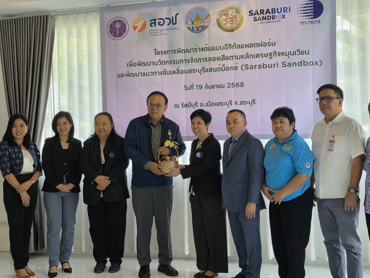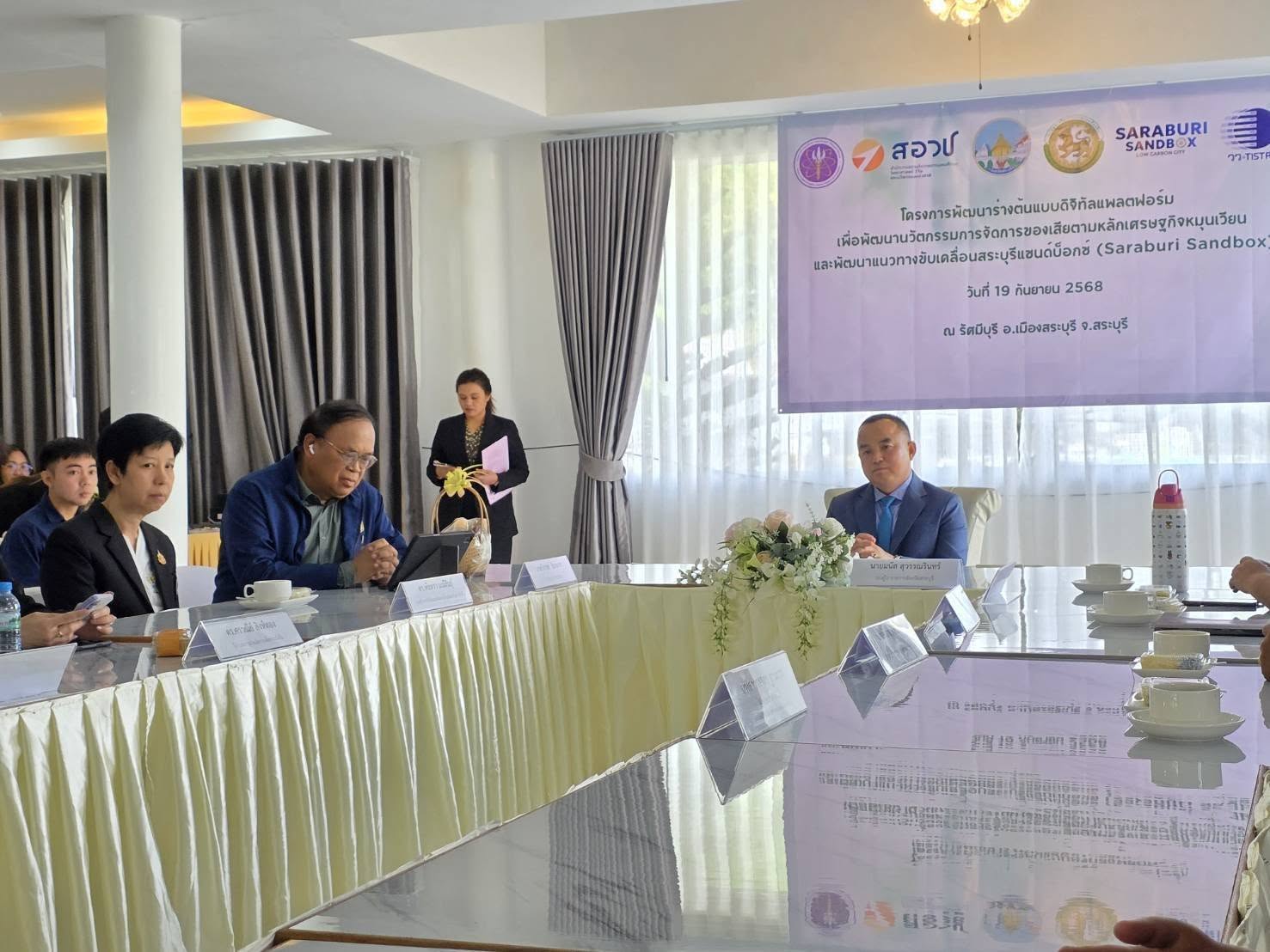 เมื่อวันที่ 19 กันยายน 2568 : สถาบันวิทยาศาสตร์และเทคโนโลยีแห่งประเทศไทย (วว.) ซึ่งได้รับสนันสนุน งบประมาณการวิจัยจากสำนักงานสภานโยบายการอุดมศึกษา วิทยาศาสตร์ วิจัยและนวัตกรรมแห่งชาติ (สอวช.) ได้ดำเนินงานโครงการพัฒนาร่างต้นแบบดิจิทัลแพลตฟอร์มเพื่อพัฒนานวัตกรรมตามหลักเศรษฐกิจหมุนเวียนและพัฒนาแนวทางขับเคลื่อนสระบุรีแซนด์บ็อกซ์ (Saraburi Sandbox) โดยในวันนี้ได้มีการจัดการประชุมนำเสนอภาพรวมการดำเนินงานโครงการฯ โดยได้เกียรติจากคุณมนัส สุวรรณรินทร์ รองผู้ว่าราชการจังหวัดสระบุรี กล่าวต้อนรับและการขับเคลื่อนเมืองสระบุรีคาร์บอนต่ำ และกล่าวเปิดงานโดย ดร.พัชทรา มณีสินธุ์ รองผู้ว่าการวิจัยและพัฒนา ด้านการพัฒนาอย่างยั่งยืน สถาบันวิจัยวิทยาศาสตร์และเทคโนโลยีแห่งประเทศไทย (วว.)