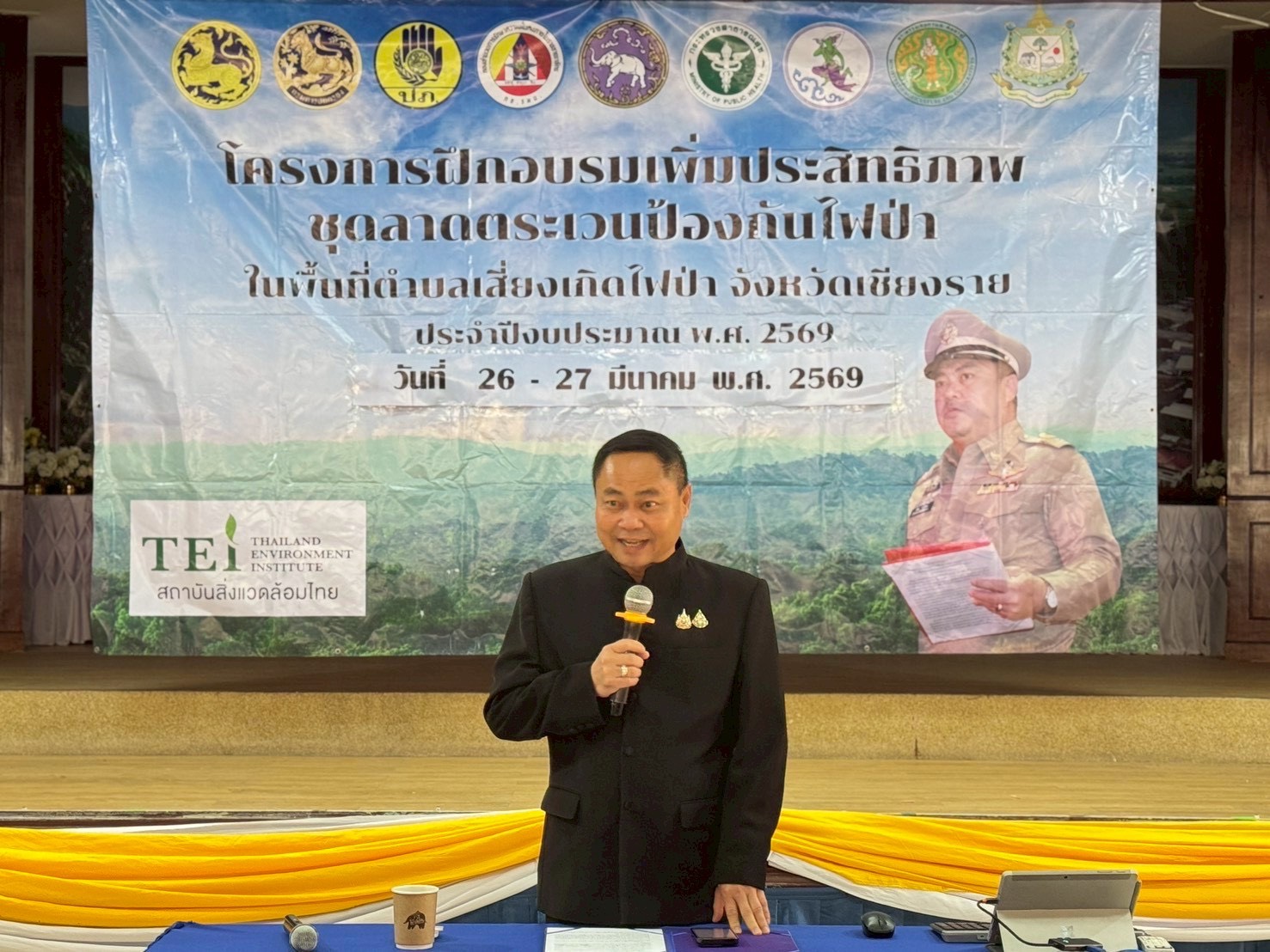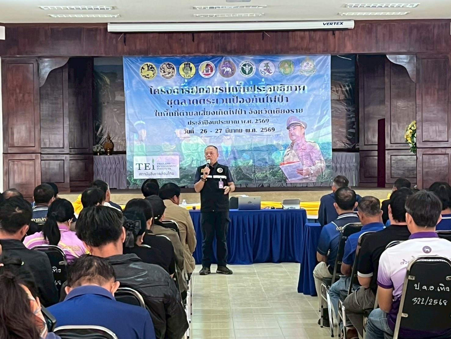26-27 มีนาคม 2569 สถาบันสิ่งแวดล้อมไทย หรือ TEI ภายใต้โครงการพัฒนาความร่วมมือเมืองคู่ขนาน ไทย–ลาว–เมียนมา เพื่อขับเคลื่อนการจัดการและลดมลพิษหมอกควันข้ามแดน ซึ่งได้รับการสนับสนุนจากสำนักงานพัฒนาการวิจัยการเกษตร (องค์การมหาชน) และสำนักงานการวิจัยแห่งชาติ (วช.) ร่วมกับที่ทำการปกครองจังหวัดเชียงราย และภาคีเครือข่ายในระดับพื้นที่ สนับสนุนการจัดโครงการฝึกอบรมเพิ่มประสิทธิภาพชุดลาดตระเวนป้องกันและดับไฟป่า ในพื้นที่ตำบลเสี่ยงเกิดไฟป่า รุ่นที่ 6 ณ หอประชุมที่ว่าการอำเภอเทิง จังหวัดเชียงราย โดยได้รับเกียรติจาก นายรุจติศักดิ์ รังษี รองผู้ว่าราชการจังหวัดเชียงราย เป็นประธานในพิธีเปิดโครงการ โดยได้มอบนโยบายและแนวทางการป้องกันและแก้ไขปัญหาไฟป่า รวมถึงฝุ่นละอองขนาดเล็ก (PM2.5) ของจังหวัดเชียงราย พร้อมเน้นย้ำความสำคัญของการบูรณาการความร่วมมือทุกภาคส่วนในการเฝ้าระวังและลดการเผาในพื้นที่