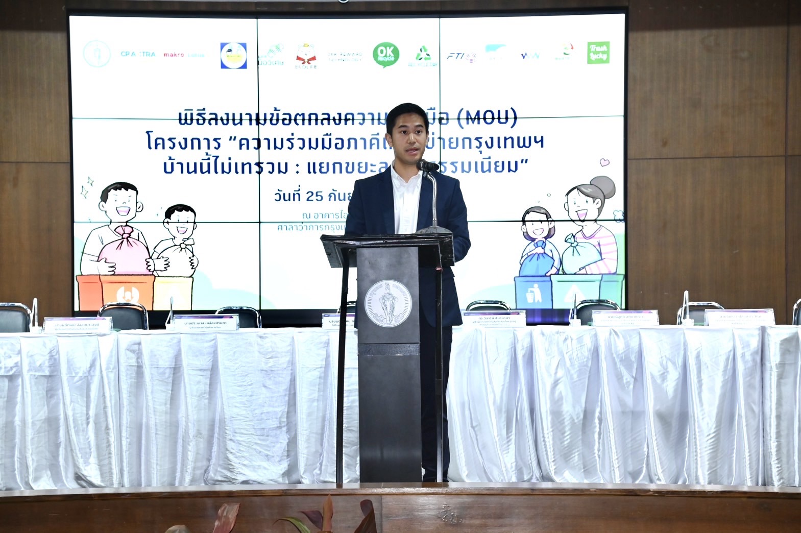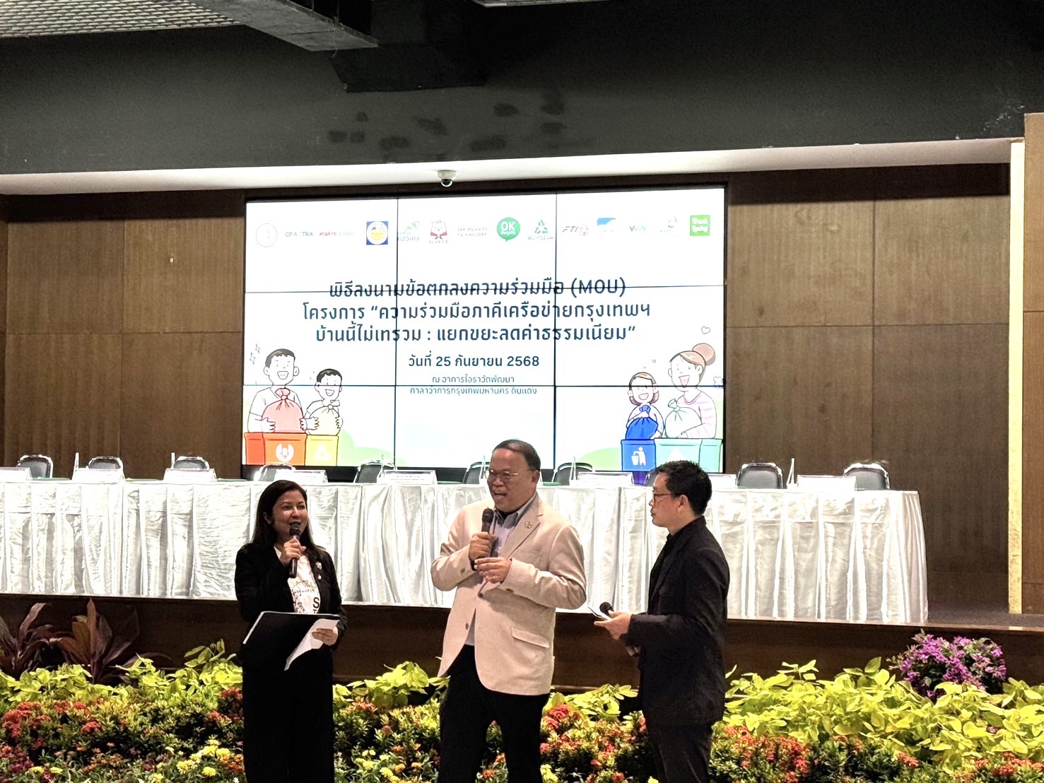25 กันยายน 2568 ณ ศาลาว่าการกรุงเทพมหานคร ดินแดง การลงนามบันทึกข้อตกลงความร่วมมือฉบับนี้ จัดทำเพื่อยืนยันการเข้าร่วมโครงการ “ความร่วมมือภาคีเครือข่ายกรุงเทพฯ บ้านนี้ไม่เทรวม : แยกขยะลดค่าธรรมเนียม” นำโดยคุณพรพรหม ณ.ส.วิกิตเศรษฐ์ ที่ปรึกษาของผู้ว่ากรุงเทพมหานคร และผู้บริหารด้านความยั่งยืนของกรุงเทพมหานครเป็นประธาน และคุณประพาส เหลืองศิรินภา ผู้อำนวยการสำนักสิ่งแวดล้อม ในฐานะผู้แทนกรุงเทพฯ พร้อมด้วย 12 ภาคีเครือข่ายกรุงเทพมหานคร ได้แก่ บริษัท ซีพี แอ็กซ์ตร้า จำกัด (มหาชน) สมาคมซาเล้งและร้านรับซื้อของเก่า มูลนิธิมือวิเศษ ECOLIFE Khaya (Jak Reward Technology) OK Recycle Recycle Day Thailand Recycoex Wake up Waste Waste Buy Delivery และ Trash Lucky เพื่อร่วมส่งเสริม และสนับสนุน เผยแพร่ข้อมูลการลงทะเบียน BKK WASTE PAY ของภาคีเครือข่ายกรุงเทพฯ กับ กทม. โดยส่งหลักฐานให้ กทม. สามารถตรวจสอบได้ และการเชื่อมต่อข้อมูล (API) และส่งหลักฐานของประชาชนที่มีการซื้อขายหรือบริจาค ขยะรีไซเคิล ขยะอินทรีย์ ขยะอันตรายกับภาคีที่เข้าร่วมโครงการลงทะเบียนบ้านนี้ไม่เทรวมกับกรุงเทพมหานคร อันเป็นการส่งเสริมภาพลักษณ์ที่ดีในการร่วมมือกับเครือข่ายภาคเอกชน และ กทม.