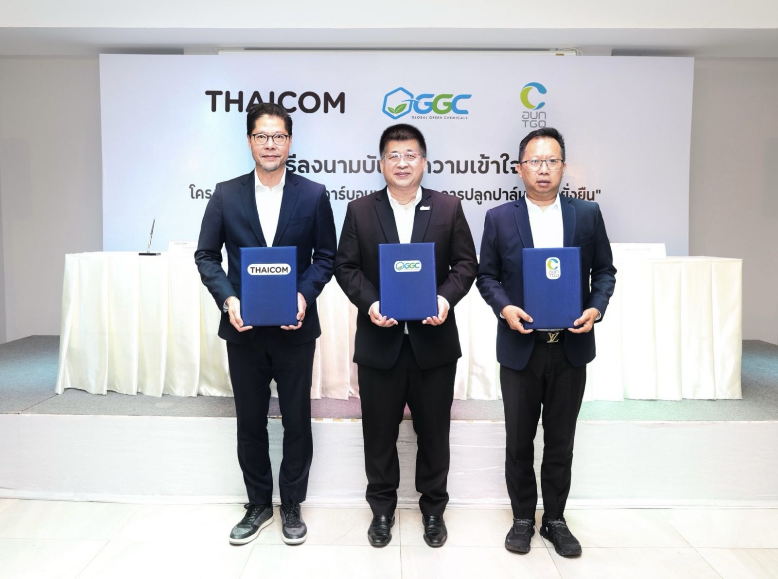 จังหวัดกระบี่ เมื่อวันที่ 26 มกราคม 2569 ที่ผ่านมา : บริษัท ไทยคม จำกัด (มหาชน) “THAICOM” ร่วมกับ บริษัท โกลบอลกรีนเคมิคอล จำกัด (มหาชน) “GGC” และ องค์การบริหารจัดการก๊าซเรือนกระจก (องค์การมหาชน) “TGO” ได้ร่วมลงนามบันทึกความร่วมมือเพื่อดำเนินโครงการ “การพัฒนาคาร์บอนเครดิตจากการปลูกปาล์มอย่างยั่งยืน” โดยมีวัตถุประสงค์สำคัญเพื่อร่วมกันศึกษาความเป็นไปได้และแนวทางการนำระบบวิทยาศาสตร์และเทคโนโลยี