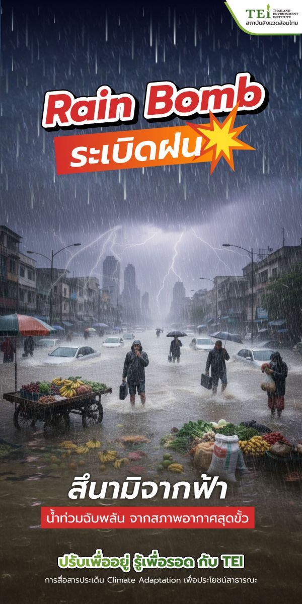 ปรับเพื่ออยู่ รู้เพื่อรอด กับ TEI: "Rain Bomb" หรือ "ระเบิดฝน" เป็นปรากฏการณ์ที่กำลังสร้างความหวาดกลัวไปทั่วโลก ภัยพิบัติจากสภาพอากาศแปรปรวน สุดขั้วที่เปรียบเสมือน "สึนามิจากฟากฟ้า" ซึ่งทวีความรุนแรงและถี่ขึ้นอย่างเห็นได้ชัดและไม่สามารถคาดการณ์ได้