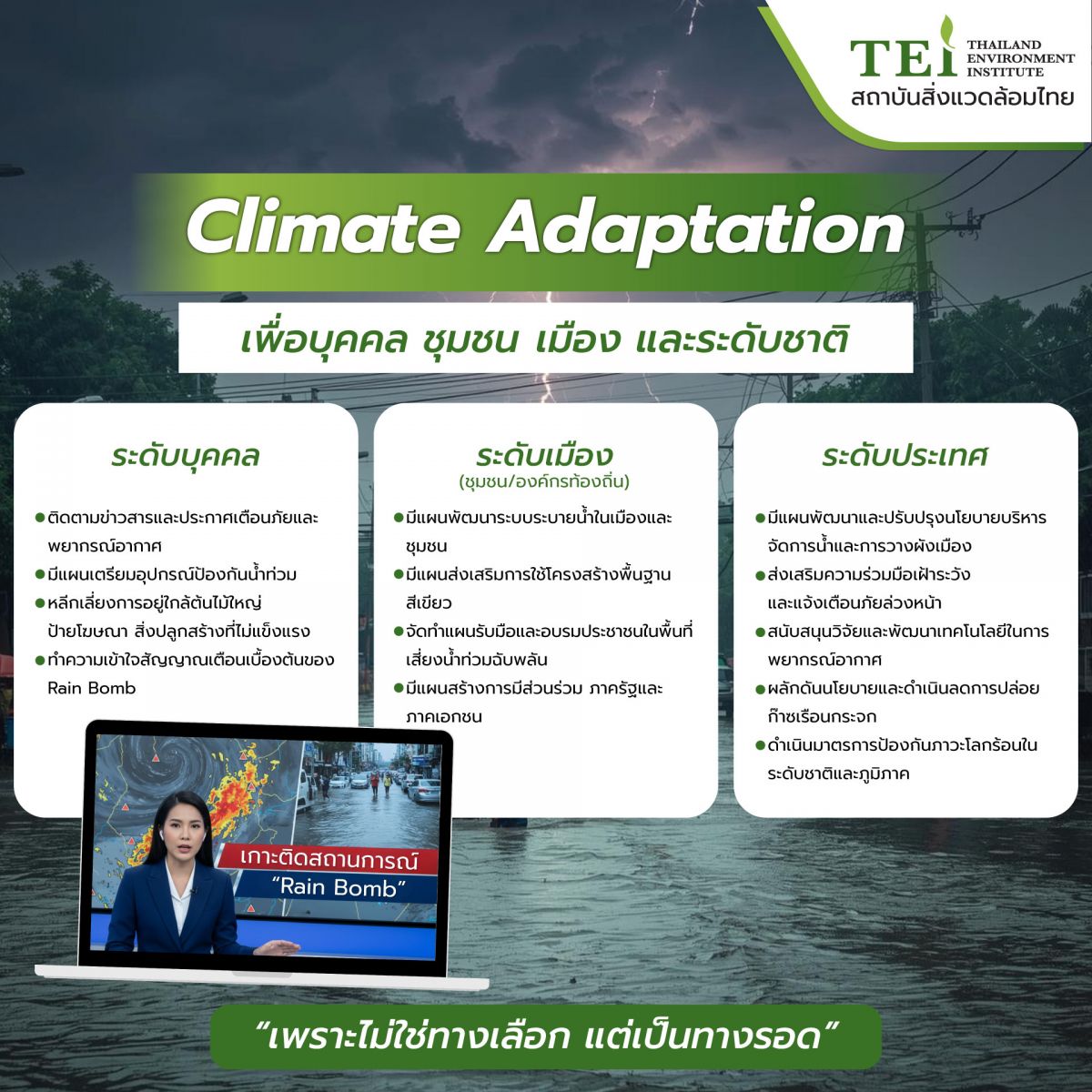 .สถาบันสิ่งแวดล้อมไทย หรือ TEI ตระหนักถึงปัญหา "ระเบิดฝน" (Rain Bomb) เพราะนี่คือสัญญาณเตือนว่า "รูปแบบฝนแบบเก่าได้สิ้นสุดลงแล้ว" และเราทุกคน จำเป็นต้องรู้ถึงความเสี่ยงจากฟ้า ทางรอดเดียวของเราคือการ ‘ปรับตัว’ หรือ Climate Adaptation เพื่ออยู่กับความผันผวนสภาพอากาศสุดขั้วที่กำลังจะมาถึงและอาจสร้างความเสียหายรุนแรง... จึงขอเป็นองค์กรที่ให้ความสำคัญในการสื่อสารประเด็น Climate Adaptation เพื่อประโยชน์สาธารณะ"