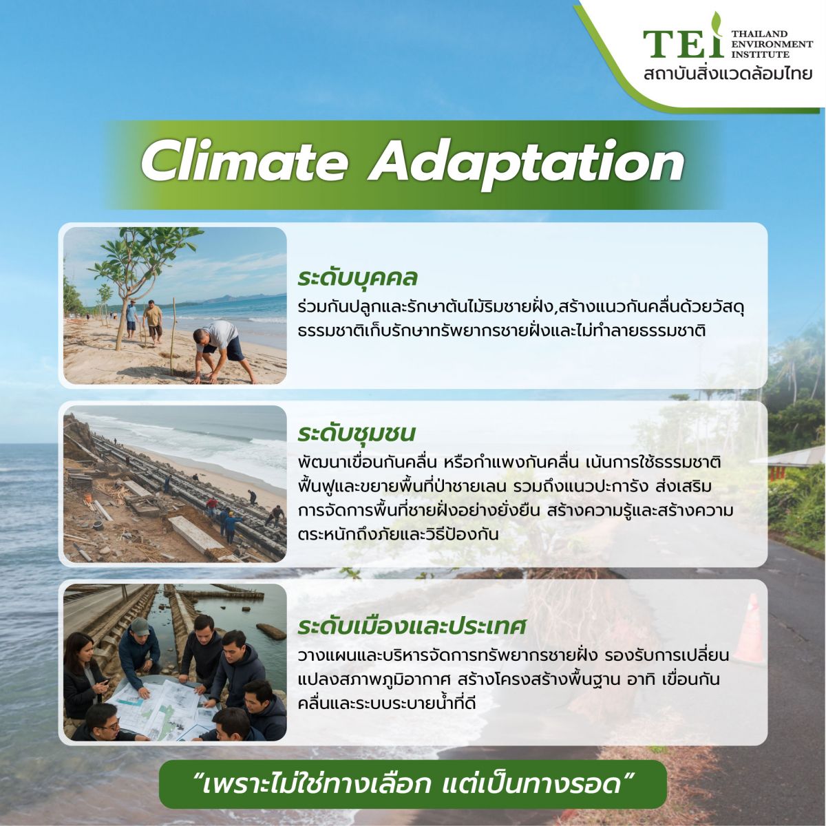 ปัญหาการกัดเซาะชายฝั่งคือหนึ่งในวิกฤตที่ชัดเจนที่สุดของ Climate Change และทางรอดเดียวของเราคือการ 'ปรับตัว' เพื่ออยู่กับความเปลี่ยนแปลงนี้ให้ได้ สถาบันสิ่งแวดล้อมไทย หรือ TEI ขอเป็นองค์กรที่ให้ความสำคัญในการสื่อสารประเด็น Climate Adaptation เพื่อประโยชน์สาธารณะ จึงขอแนะนำแนวทาง "ปรับเพื่ออยู่ รู้เพื่อรอด" เพื่อรับมือปัญหาการกัดเซาะชายฝั่ง ตั้งแต่ระดับบุคคล ชุมชน จนถึงระดับประเทศ ดังนี้: