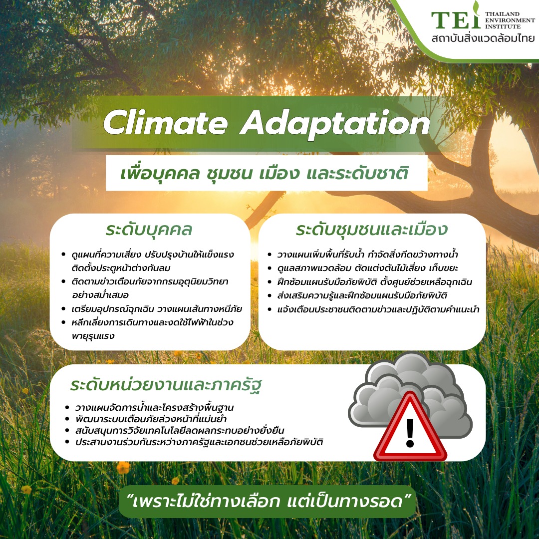 สถาบันสิ่งแวดล้อมไทย (TEI) เสนอแนวทางการปรับตัวต่อการเปลี่ยนแปลงสภาพภูมิอากาศ (Climate Adaptation) ตามแนวคิด "ปรับเพื่ออยู่ รู้เพื่อรอด" แบ่งเป็น 3 ระดับ